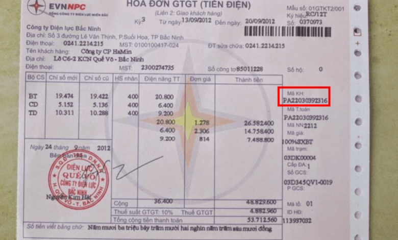Dưới đây là hình minh họa cho mã số khách hàng và hóa đơn thanh toán điện mẫu: